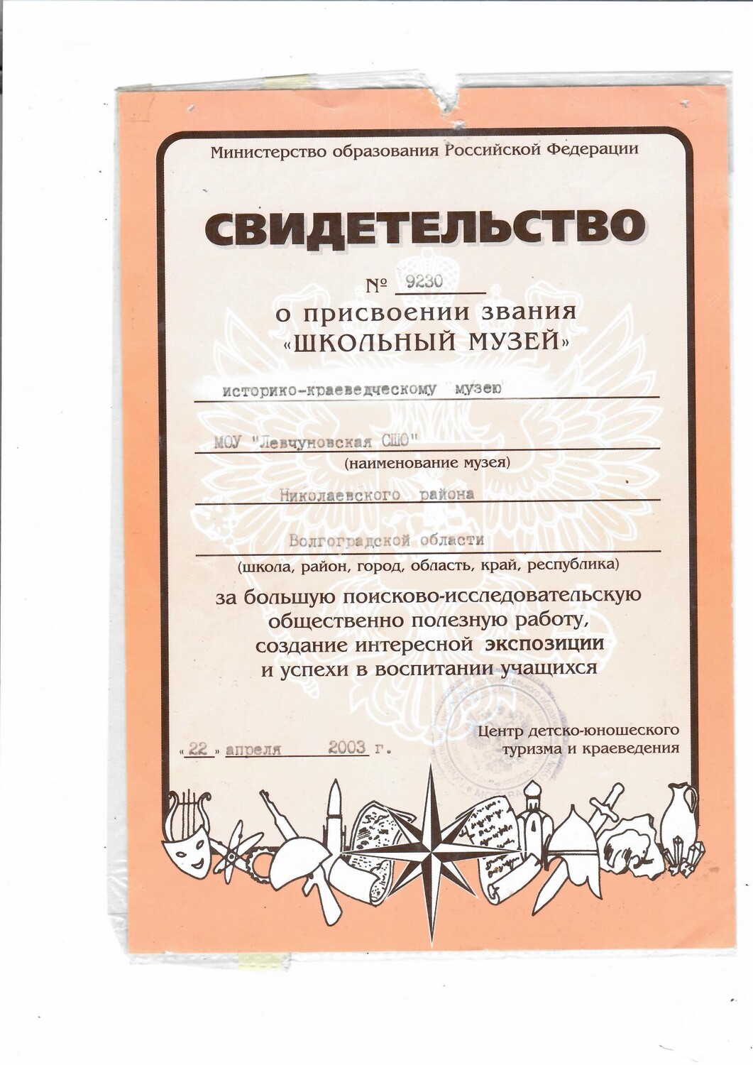 Школьный музей Левчуновского филиала МОУ "Политотдельская СШ"